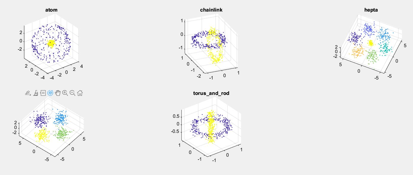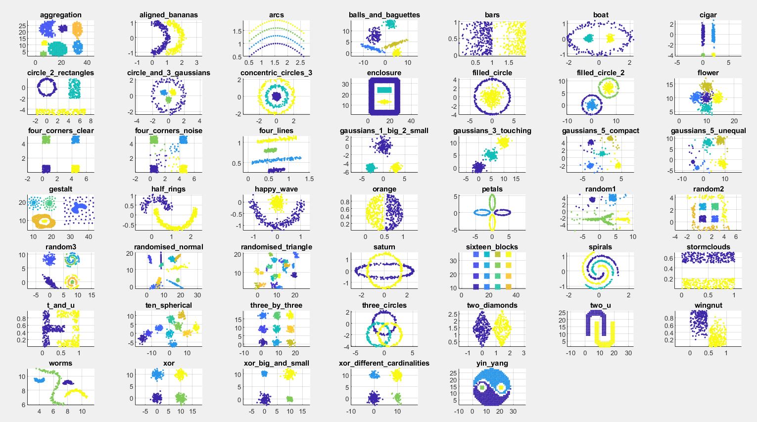This GitHub repository contains MATLAB code for generating 2D and 3D synthetic/toy/artificial datasets. The datasets have been previously used in various publications, mostly for rapid testing of classification and clustering methods. A sample of the datasets can be downloaded from here. Currently, there are 52 datasets: 47 two-dimensional sets